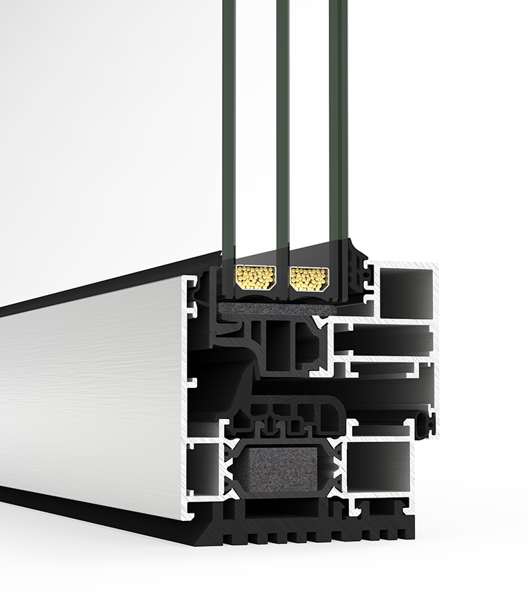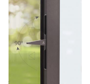 Hidden sash hinged system compatible with any standard 16 groove hardware. Its attractive design is based on the concealment of the sash behind the frame, reducing the aluminium interlock profile to up to 73.8 mm. Thus achieving a glazed surface that can reach 85% of the totality of the window’s glazing, facilitating the entry of light to the interior of the rooms. Its avant-garde aesthetic is completed with the possibility of concealing the drainage and hinges.
