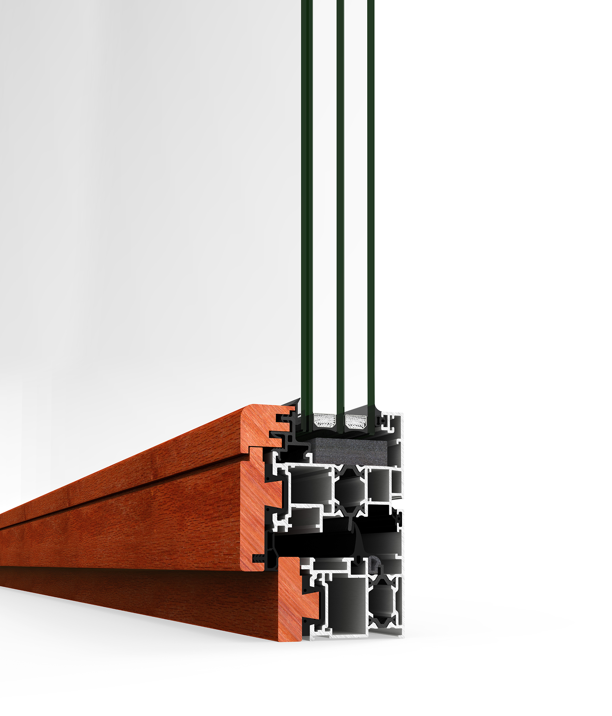 Thermally broken mixed system that combines an external aluminium profile and its excellent performance with the warmth and design that an internal timber profile provides.The extensive range of CORTIZO powder coating or anodising finishes, any of them may be selected for the surface treatment of the external face. On the other hand, the internal face is available in American oak, sapelly, mellis pine and other timber options available on request, all of them treated with a transparent, satin, dissolvent free ecological varnish.