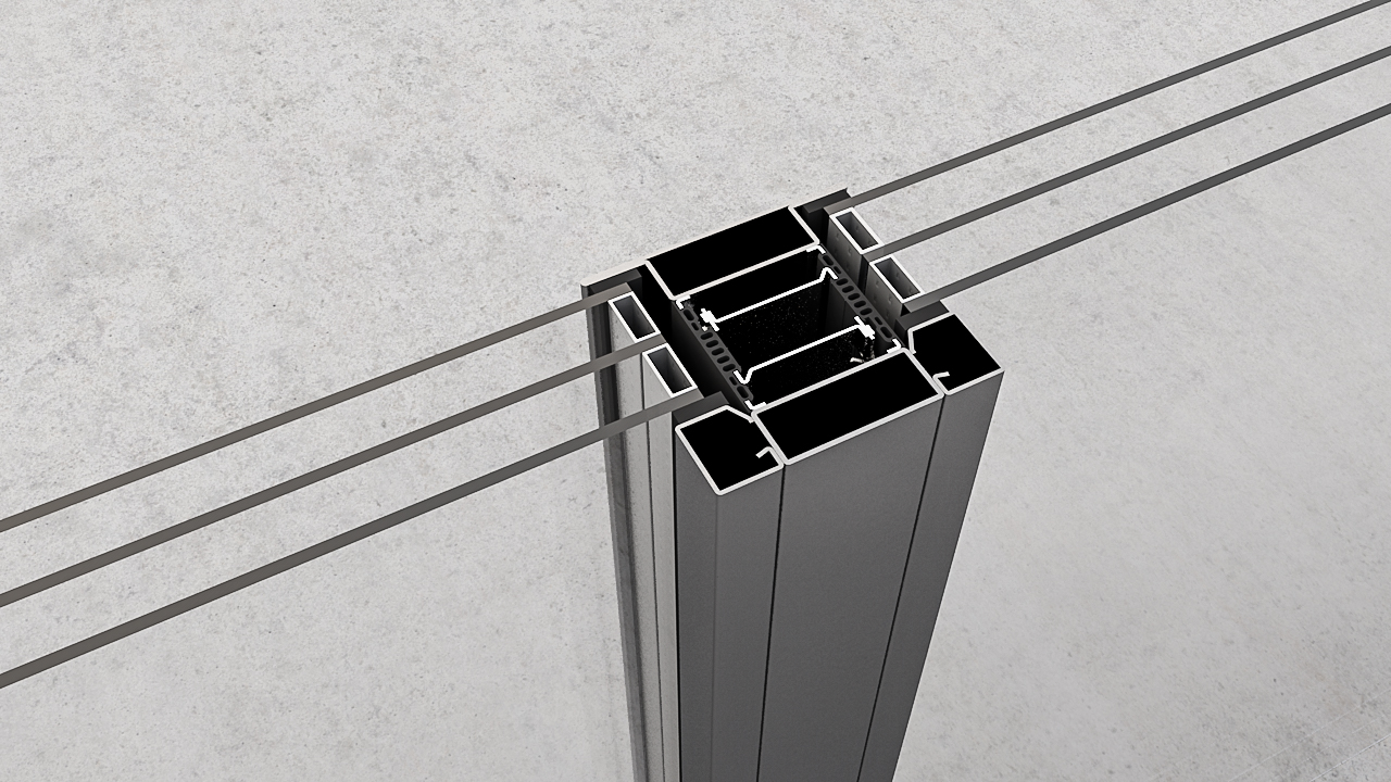 Safety solutions such as fire protection and anti-burglary protection can be added when required. By replacing only a few components, fire protection class EI230 can also be reached. The open stainless steel insulator allows easy access to the profile interior and thus enables the corresponding cables to be installed in the event of changing use.