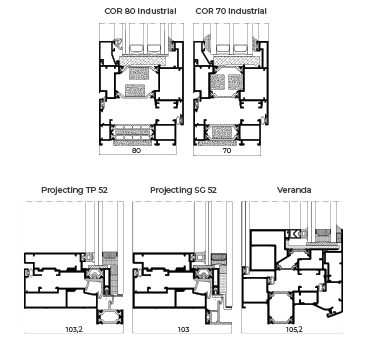 This system is compatible with the TP 52 and SG 52 curtain-wall façade lines, the COR 80 and COR 70 Industrial carpentries and the Veranda System.