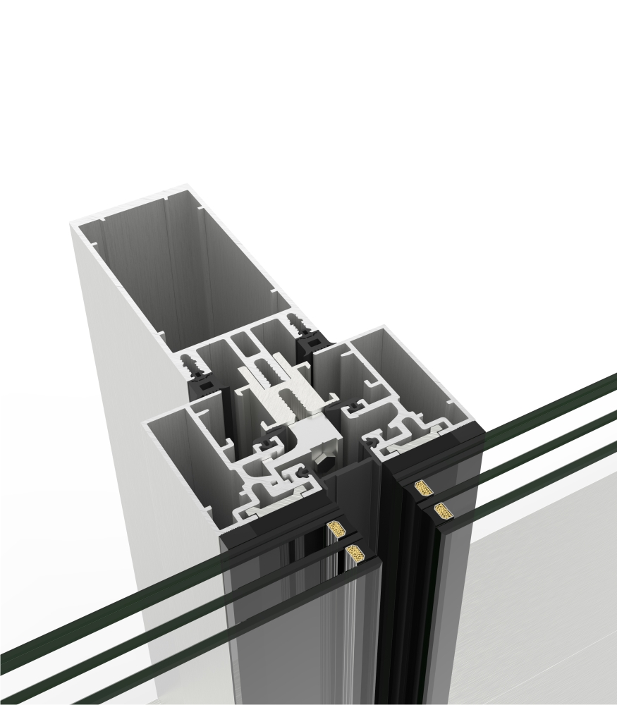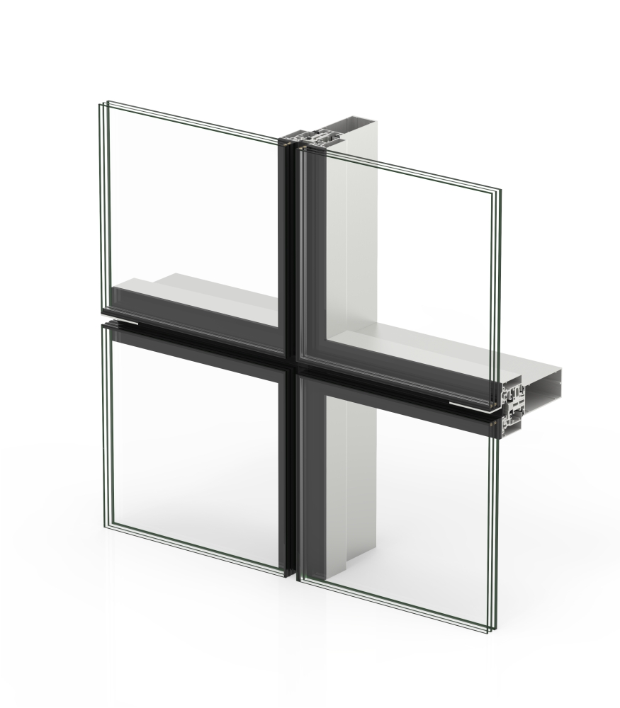 Extensive profile range, their mechanical unions allow for all types of façades to be built (vertically, inclined, 90° corners, corners, polygonal) as well as solving large and heavy glazing modulations